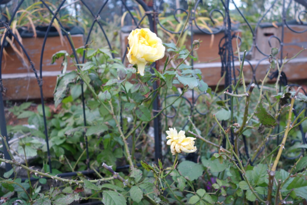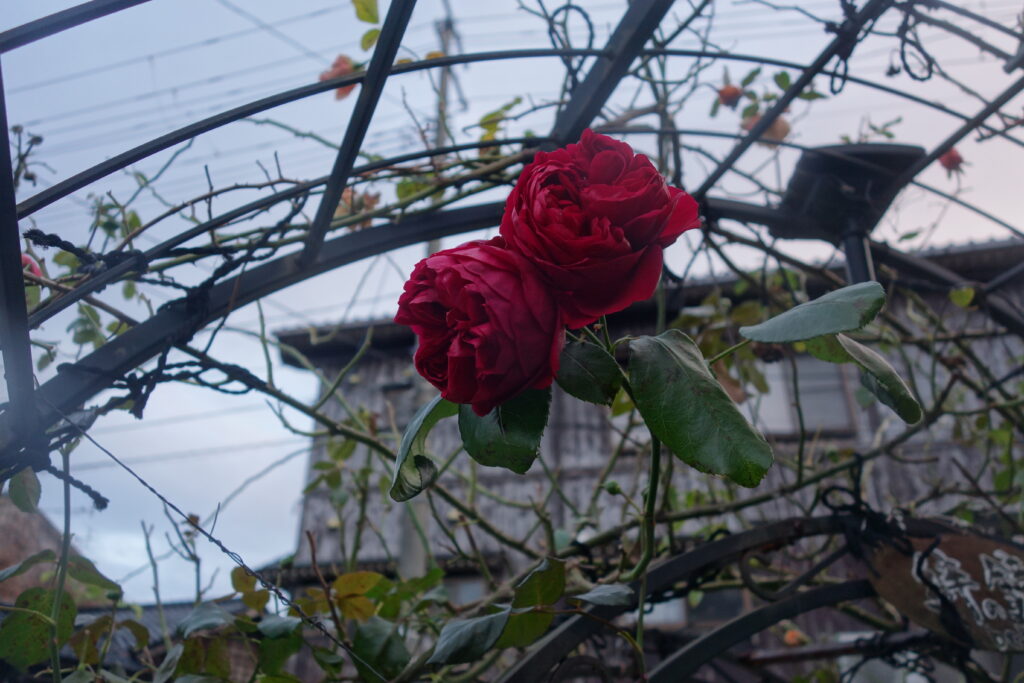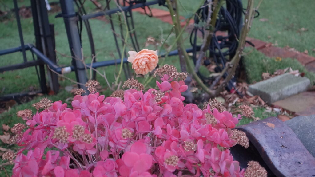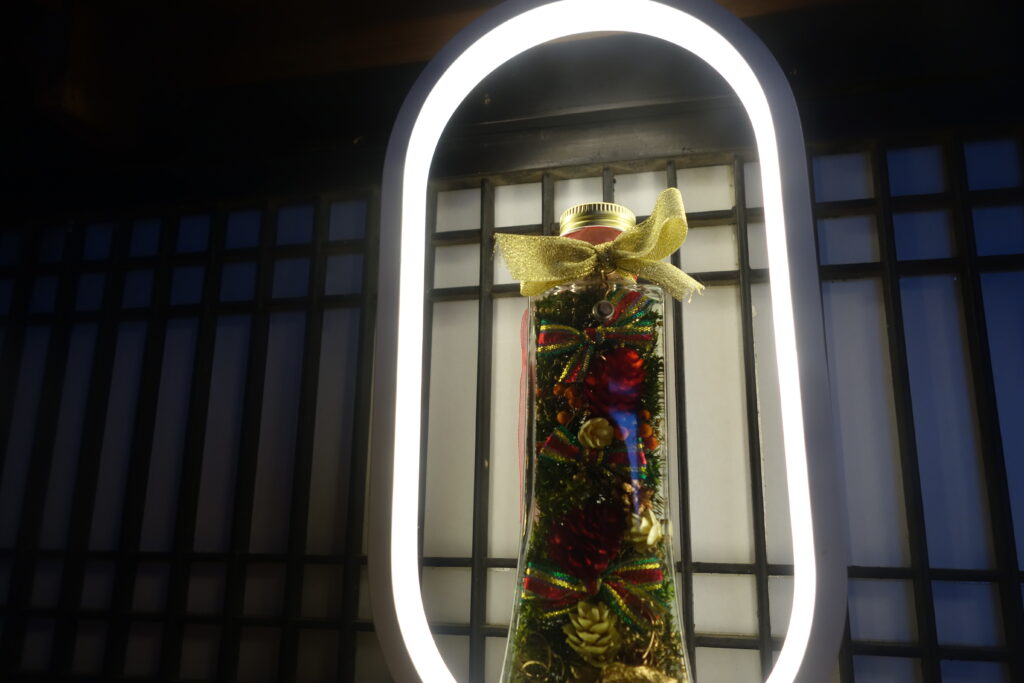 音楽茶屋カウンターのライト前にセット。テラスには、遅咲きの秋薔薇もチラホラ・・・JAZZ Xmasソングなどで11月最終週の「おもてなし」