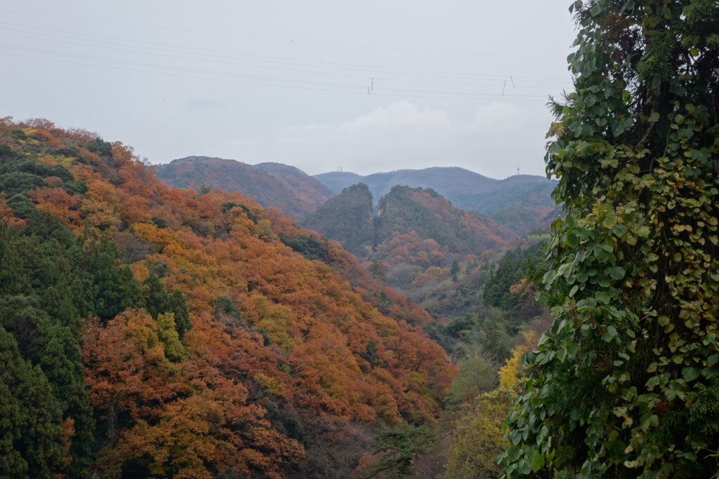 素直に綺麗です。紅葉の毛布に包まれた「道遊の割戸」 京町通り大工町手前「木々の間」からの展望。
