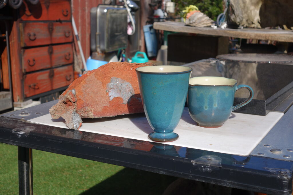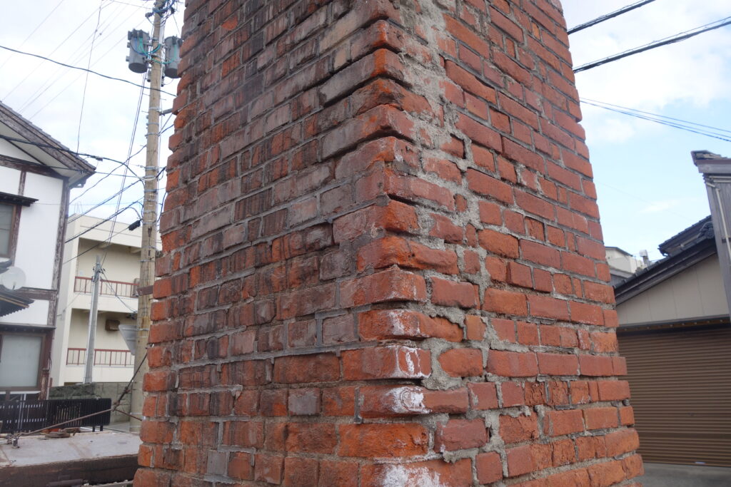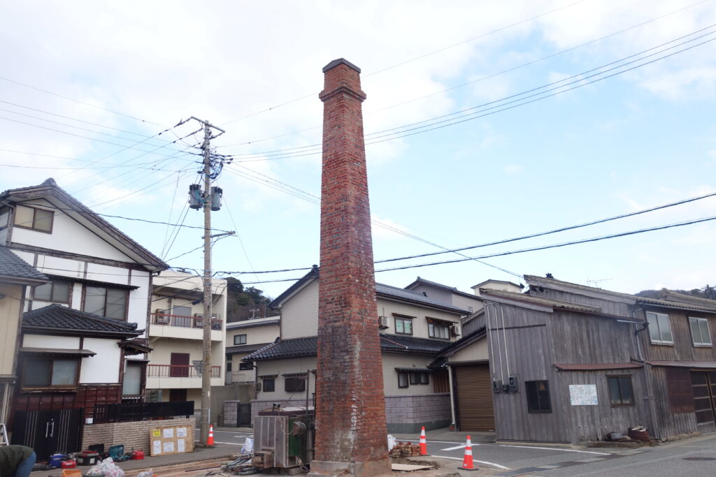 文平釡の煙突は、相川の象徴でもありました。家屋の老朽化に伴い、撤去されます。味わい深い「文平ブルー」特注フリーカップでおもてなししています。(写真は解体中のレンガを背景に)「ありがとう、ケンさん」
