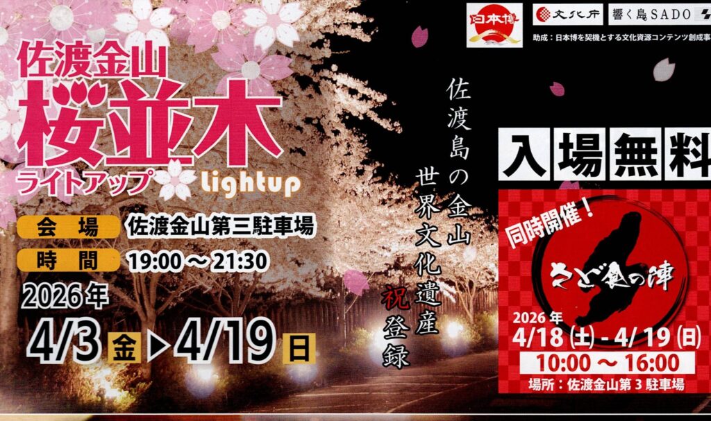 投稿日: 2026年4月3日 投稿者: shizensinyuu「佐渡金山:桜ライトアップ」 本日(4/3)からライトアップ。1本だけ咲いています。これからでしょうね・・・。山ゆえ、夜は寒いので、暖かくしておいでください。期間 4/3(金)~19(日) 19:00~21:30